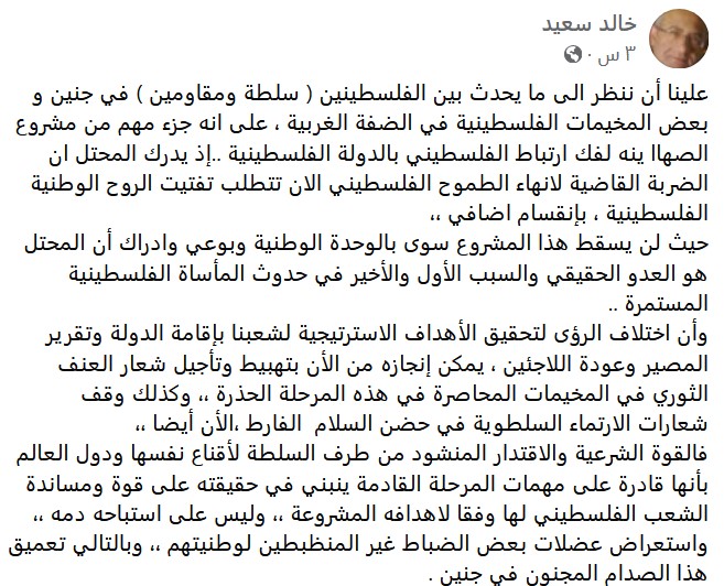 وقال الناشط خالد سعيد: “علينا أن ننظر الى ما يحدث بين الفلسطينين ( سلطة ومقاومين ) في جنين و بعض المخيمات الفلسطينية في الضفة الغربية ، على انه جزء مهم من مشروع الصهاا ينه لفك ارتباط الفلسطيني بالدولة الفلسطينية ..إذ يدرك المحتل ان الضربة القاضية لانهاء الطموح الفلسطيني الان تتطلب تفتيت الروح الوطنية الفلسطينية ، بإنقسام اضافي ،، حيث لن يسقط هذا المشروع سوى بالوحدة الوطنية وبوعي وادراك أن المحتل هو العدو الحقيقي والسبب الأول والأخير في حدوث المأساة الفلسطينية المستمرة”.