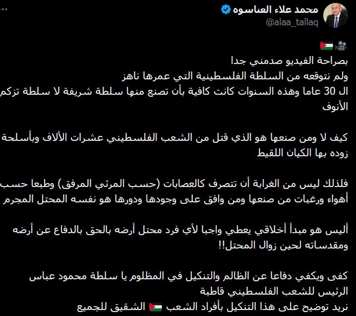 أما محمد علاء فعلق: “بصراحة الفيديو صدمني جدا، ولم نتوقعه من السلطة الفلسطينية التي عمرها ناهز، ال 30 عاما وهذه السنوات كانت كافية بأن تصنع منها سلطة شريفة لا سلطة تزكم الأنوف”.