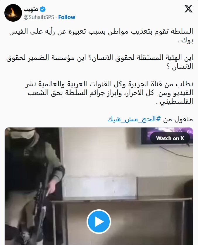 وأضاف: “نطلب من قناة الجزيرة وكل القنوات العربية والعالمية نشر الفيديو ومن كل الاحرار، وابراز جرائم السلطة بحق الشعب الفلسطيني”.
