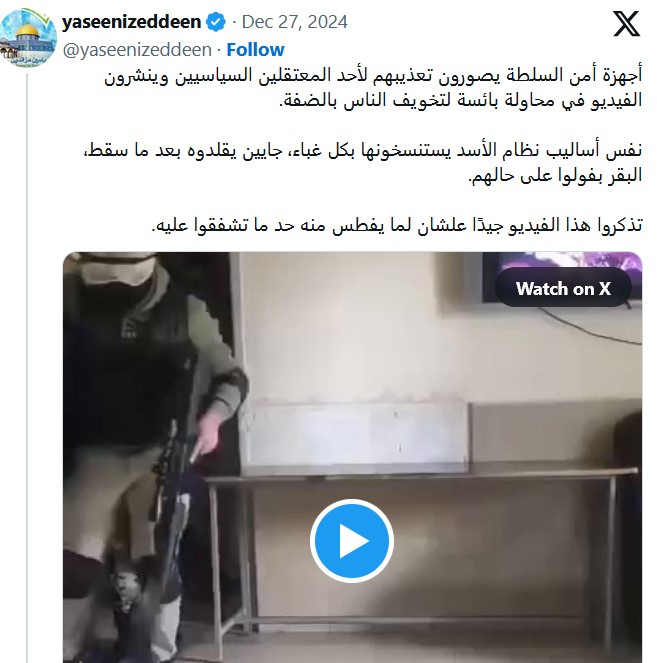 ياسين عز الدين كتب على منصة إكس قائلاً: “أجهزة أمن السلطة يصورون تعذيبهم لأحد المعتقلين السياسيين وينشرون الفيديو في محاولة بائسة لتخويف الناس بالضفة”.