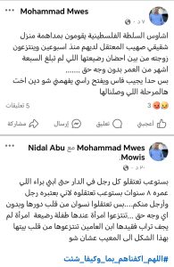 وجاء في منشور كتبه ابو مويس عبر حسابه على منصة فيسبوك: “اشاوس السلطة الفلسطينية يقومون بمداهمة منزل شقيقي صهيب المعتقل لديهم منذ اسبوعين وينتزعون زوجته من بين احضان رضيعتها اللي لم تبلغ السبعة اشهر من العمر بدون وجه حق بس حدا يجيب فاس ويفتح راسي يفهمني شو دين اخت هالمرحلة اللي وصلنالها”.