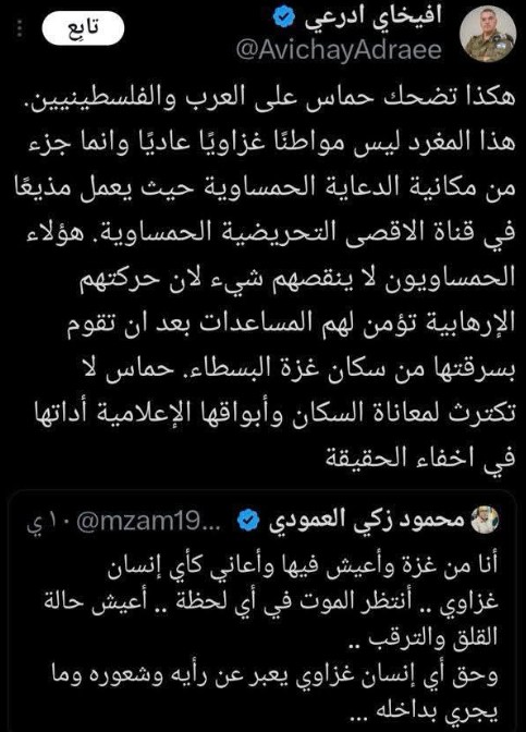 أفخاي أدرعي الناطق باسم جيش الاحتلال، يقوم بإعادة نشر ما ينشره ذلك الذباب الإلكتروني، في خطوة أكدت التكامل في المهام بين الناطق باسم جيش الاحتلال وذلك الذباب، ليقول للعالم إن من بينهم من يؤكد معلوماتنا بشأن الأهداف.