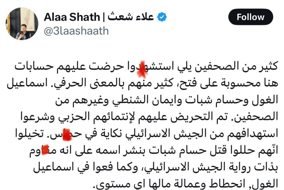 وكتب الناشط الفلسطيني علاء شعت في منشور له على تويتر: “كتير من الصحفيين يلي استشهدوا حرضت عليهم حسابات هنا محسوبة على فتح، كتير منهم بالمعنى الحرفي، إسماعيل الغول وحسام شبات وإيمان الشنطي وغيرهم من الصحفيين”.