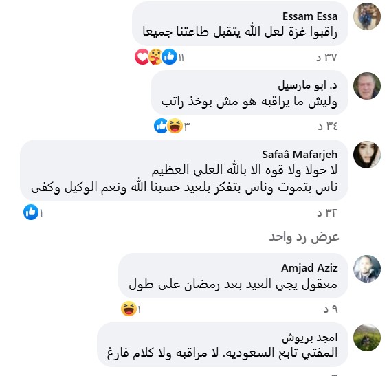 فيما قال مطيع عرفات: “والعلم عند الله انه لا يجوز لا صيام ولا قيام ل جميع المسلمين على وجه الأرض، سيدنا محمد صلى الله عليه وسلم قال من بات ولم يهمه امر المسلمين فليس منهم فكيف نرى ولا نتكلم نرى الناس يقتلون بالعشرات ويبادوا ويموتون جوعا ولا يتحرك ساكن”.
