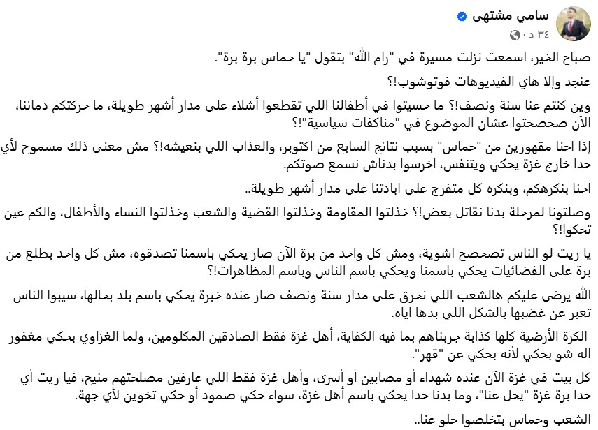 وقال الإعلامي “سامي مشتهى” في منشور له على فيسبوك: “صباح الخير، اسمعت نزلت مسيرة في “رام الله” بتقول “يا حماس برة برة”> عنجد وإلا هاي الفيديوهات فوتوشوب!؟”.