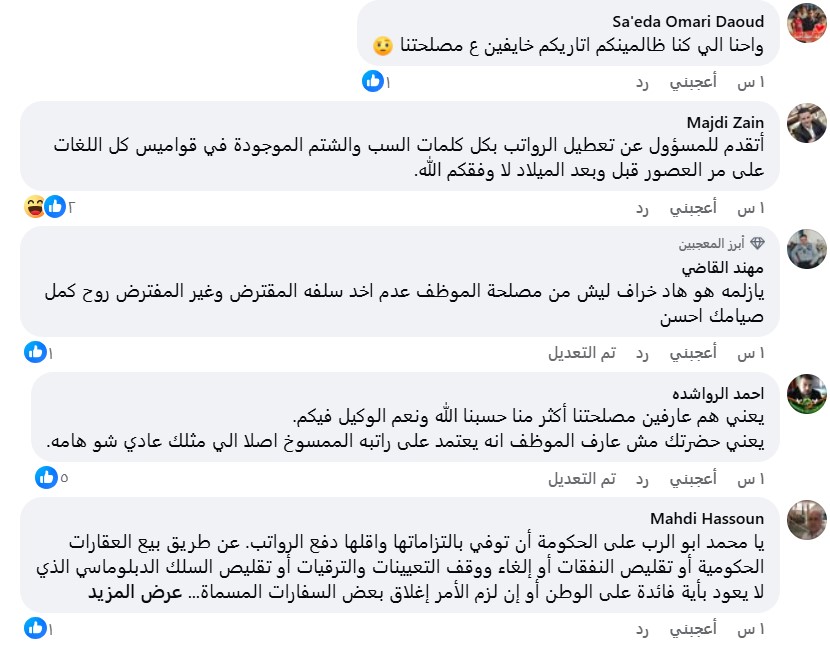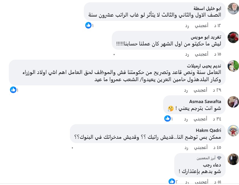 وفيما يلي بعض آراء المواطنين والموظفين كما عكستها منصات التواصل الاجتماعي حول تصريحات أبو الرب.