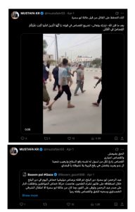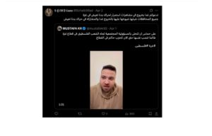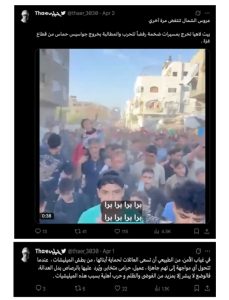 ونشر حساب باسم “MUSTAFA KR” نحو 27 تغريدة في الأيام الأربعة الأولى من أبريل، ركزت 55.6% منها على مهاجمة حماس والتحريض عليها، بينما 11% من التغريدات ركزت على توثيق الجرائم الإسرائيلية، ونحو 15% من التغريدات ركزت على تطورات الحرب، بينما نحو 18% من التغريدات تناولت مضامين أخرى.