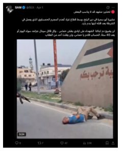 جرت عمليات تداول مكثفة لفيديو قتل الشرطي “إبراهيم عوني شلدان” من حسابات داخل قطاع غزة على موقع (X)-تويتر سابقا-، إذ بدأ التداول في الساعة الخامسة عصر يوم الثلاثاء 1 أبريل/نيسان بتوقيت فلسطين.