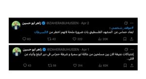 ومن بين الحسابات التي نشطت في حملة التحريض حسابا يحمل اسم زاهر ابو حسين، والذي نشر خلال تلك الفترة 136 تغريدة، كان 37.5% منها مخصصا للتحريض ضد حركة حماس بقطاع غزة، فضلًا عن الترويج لمعلومات مضللة من بينها وجود اشتباكات بين حماس وعائلة أبو سمرة، قبل أن تتضح الرواية الأصلية التي راح ضحيتها الشاب “عبد الرحمن أبو سمرة” دون وجود اشتباكات.