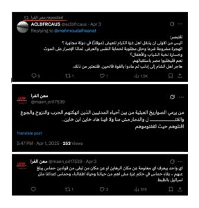 كما نشط حساب باسم “ 𝔾𝕒𝕫𝕒 || 𝕊 𓂆 𝒪𝐵 ” في نشر خطاب كراهية وتحريض، إذ من بين 68 تغريدة نشرها خلال الأيام الأربعة الأولى من أبريل، كانت 72% من التغريدات تحريضية ضد حماس أو تهاجمها، بينما ما يزيد عن 20% فقط من التغريدات تناولت التطورات الميدانية للحرب، ونحو 7% من التغريدات تناولت قضايا أخرى.