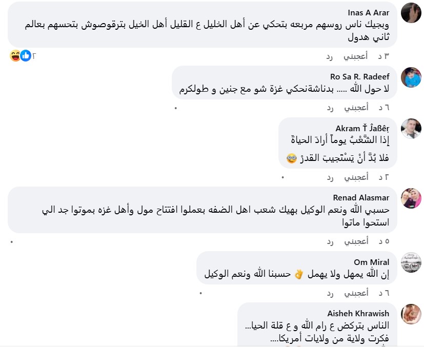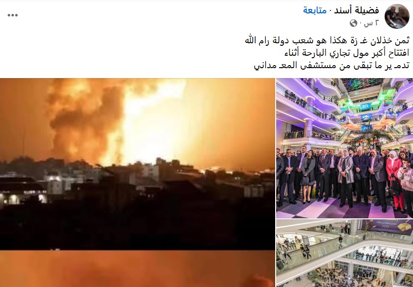 أما فضيلة أسند فكتبت: ” ثمن خذلان غـزة هكذا هو شعب دولة رام الله، افتتاح أكبر مول تجاري البارحة أثناء.. تدمـير ما تبقى من مستشفى المعـ مداني”.