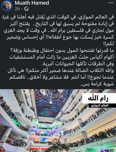 وعلق الناشط معاذ حامد قائلاً: “في العالم الموازي في الوقت الذي يقتل فيه أهلنا في غزة في إبادة مفتوحة لم يسبق لها في التاريخ يفتتح أكبر مول تجاري في فلسطين برام الله في وقت لا يجد الغزي كسرة خبز يسكت بها جوع أطفاله”.