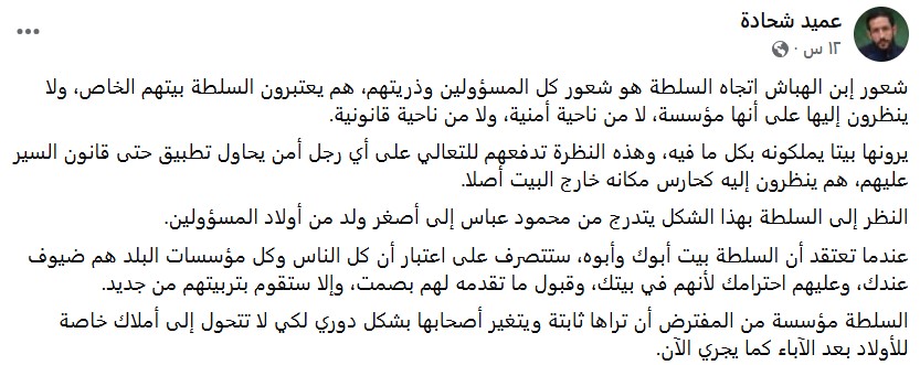 وتابع: “عندما تعتقد أن السلطة بيت أبوك وأبوه، ستتصرف على اعتبار أن كل الناس وكل مؤسسات البلد هم ضيوف عندك، وعليهم احترامك لأنهم في بيتك، وقبول ما تقدمه لهم بصمت، وإلا ستقوم بتربيتهم من جديد. السلطة مؤسسة من المفترض أن تراها ثابتة ويتغير أصحابها بشكل دوري لكي لا تتحول إلى أملاك خاصة للأولاد بعد الآباء كما يجري الآن”.