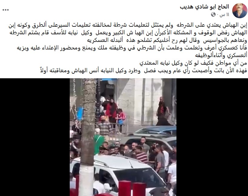 أبو شادي هديب علق بالقول: ” إبن الهباش يعتدي على الشرطه ولم يمتثل لتعليمات شرطة لمخالفته تعليمات السيرعلى ألطرق وكونه إبن الهباش رفض الوقوف و المشكله الأكبرأن إبن الهبا ش الكبير ويعمل وكيل نيابه للأسف قام بشتم الشرطه ونعاهم بالجواسيس وقال لهم رح أخلىيكم تشلحو هذه ألبدله العسكريه”.