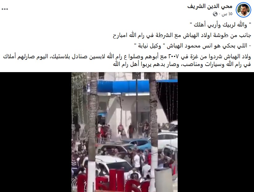 وأضاف: “ولاد الهباش شردوا من غزة في ٢٠٠٧ مع أبوهم وصلوا ع رام الله لابسين صنادل بلاستيك، اليوم صارلهم أملاك في رام الله وسيارات ومناصب، وصار بدهم يربوا أهل رام الله”.