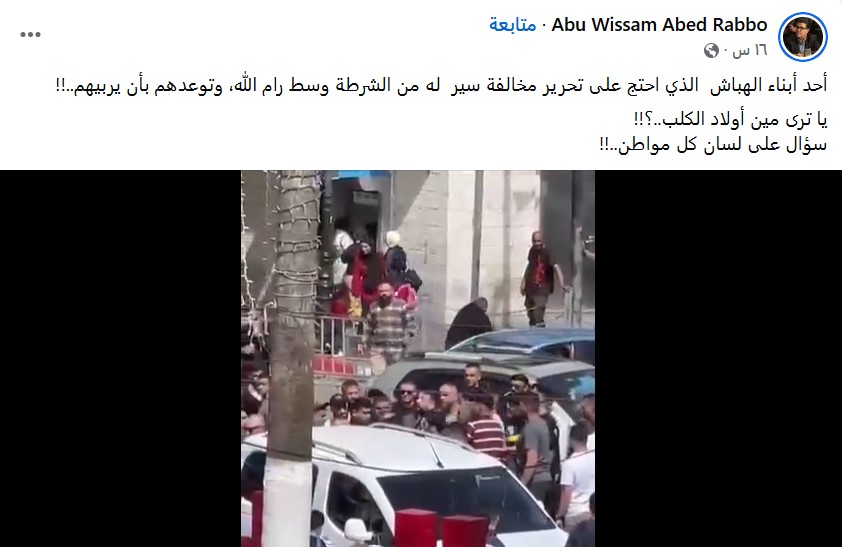 أبو وسيم من بيت حانينا بالقدس علق قائلاً: ” أحد أبناء الهباش الذي احتج على تحرير مخالفة سير له من الشرطة وسط رام الله، وتوعدهم بأن يربيهم..!! يا ترى مين أولاد الكلب..؟!! سؤال على لسان كل مواطن..!!”.
