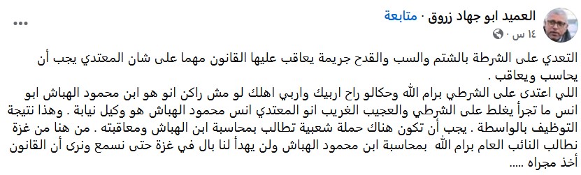 أما أبو جهاد زروق فكتب: “التعدي على الشرطة بالشتم والسب والقدح جريمة يعاقب عليها القانون مهما على شان المعتدي يجب أن يحاسب ويعاقب”.