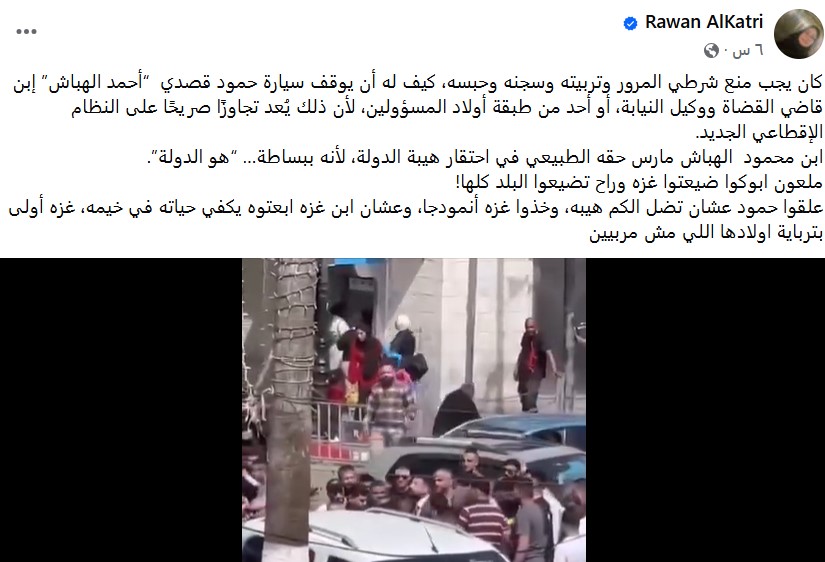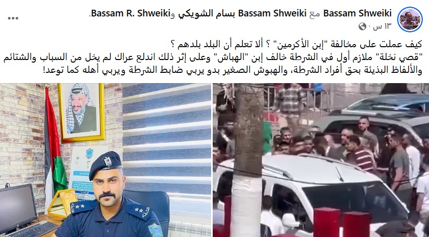 بسام الشوبكي كتب قائلاً: “كيف عملت على مخالفة “إبن الأكرمين” ؟ ألا تعلم أن البلد بلدهم ؟ “قصي نخلة” ملازم أول في الشرطة خالف إبن “الهباش” وعلى إثر ذلك اندلع عراك لم يخل من السباب والشتائم والألفاظ البذيئة بحق أفراد الشرطة، والهبوش الصغير بدو يربي ضابط الشرطة ويربي أهله كما توعد!”.