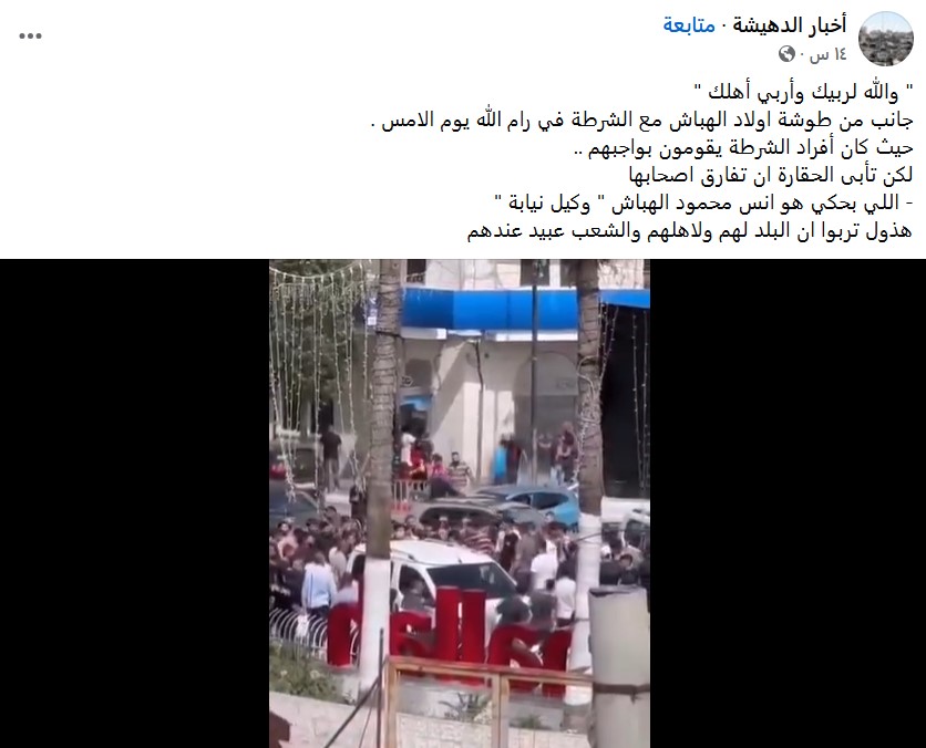 صفحة أخبار مخيم الدهيشة كتبت قائلةً: “والله لربيك وأربي أهلك، جانب من طوشة اولاد الهباش مع الشرطة في رام الله يوم الامس، حيث كان أفراد الشرطة يقومون بواجبهم .. لكن تأبى الحقارة ان تفارق أصحابها، اللي بحكي هو انس محمود الهباش ” وكيل نيابة ” هذول تربوا ان البلد لهم ولاهلهم والشعب عبيد عندهم”.