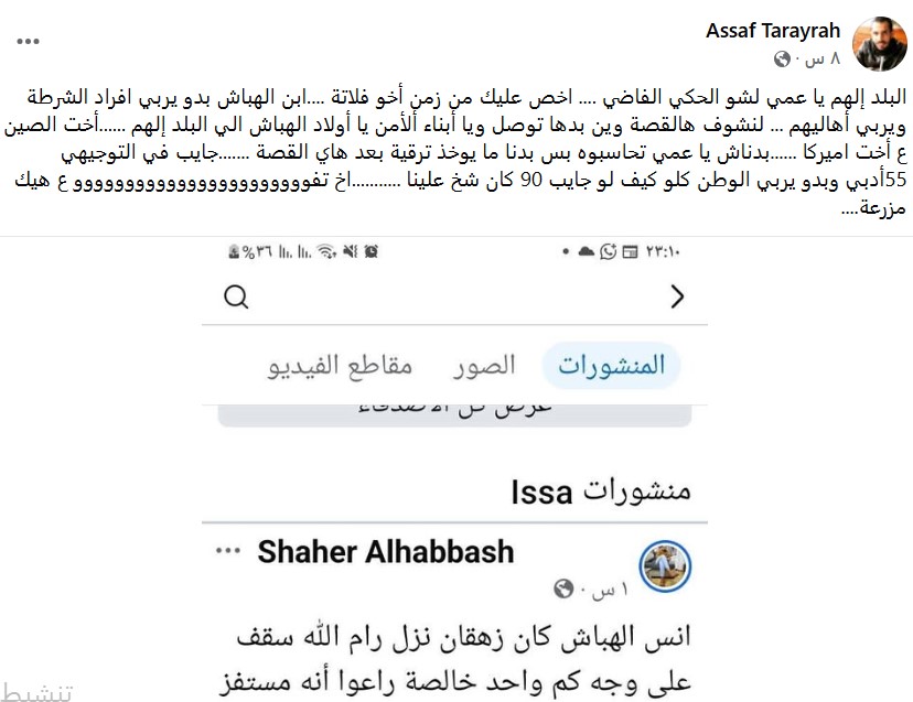 أسيف كتب قائلاً: البلد إلهم يا عمي لشو الحكي الفاضي …. اخص عليك من زمن أخو فلاتة ….ابن الهباش بدو يربي افراد الشرطة ويربي أهاليهم … لنشوف هالقصة وين بدها توصل ويا أبناء ألأمن يا أولاد الهباش الي البلد إلهم، أخت الصين ع أخت أميركا.. بدناش يا عمي تحاسبوه بس بدنا ما يوخذ ترقية بعد هاي القصة، جايب في التوجيهي 55أدبي وبدو يربي الوطن كلو كيف لو جايب 90 كان شخ علينا. .اخ تفووووووووووووووووووووووو ع هيك مزرعة”.