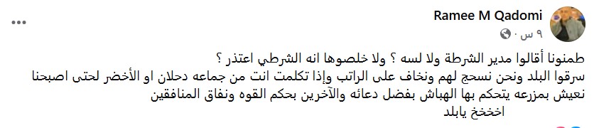 رامي القدومي علق قائلاً: “طمنونا أقالوا مدير الشرطة ولا لسه ؟ ولا خلصوها انه الشرطي اعتذر؟ سرقوا البلد ونحن نسحج لهم ونخاف على الراتب وإذا تكلمت انت من جماعه دحلان او الأخضر لحتى اصبحنا نعيش بمزرعه يتحكم بها الهباش بفضل دعائه والآخرين بحكم القوه ونفاق المنافقين اخخخخ يا بلد”.