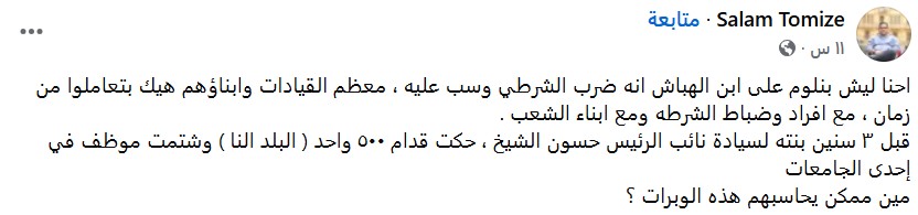 سليم طميزة كتب قائلاً: “احنا ليش بنلوم على ابن الهباش انه ضرب الشرطي وسب عليه ، معظم القيادات وابناؤهم هيك بتعاملوا من زمان ، مع افراد وضباط الشرطه ومع ابناء الشعب . قبل ٣ سنين بنته لسيادة نائب الرئيس حسون الشيخ ، حكت قدام ٥٠٠ واحد ( البلد النا ) وشتمت موظف في إحدى الجامعات، مين ممكن يحاسبهم هذه الوبرات ؟”.