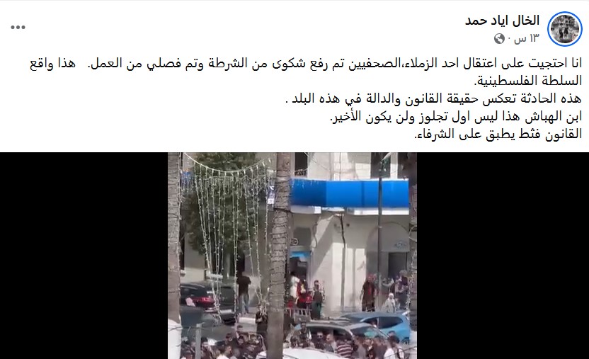 إياد حمد كتب قائلاً: “انا احتجيت على اعتقال احد الزملاء،الصحفيين تم رفع شكوى من الشرطة وتم فصلي من العمل. هذا واقع السلطة الفلسطينية. هذه الحادثة تعكس حقيقة القانون والدالة في هذه البلد . ابن الهباش هذا ليس اول تجلوز ولن يكون الأخير. القانون فثط يطبق على الشرفاء”.