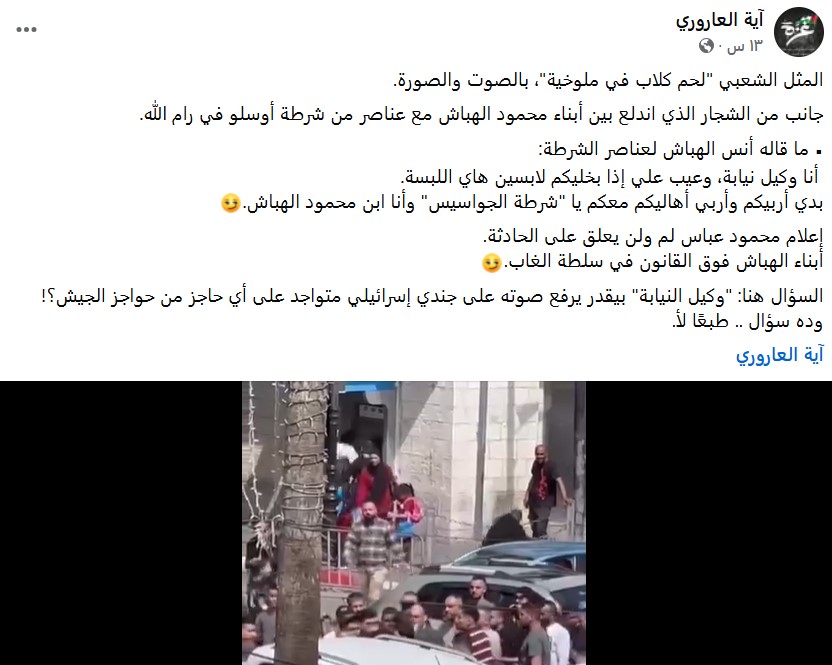 آية العاروري كتب على حسابها على فيسبوك: “المثل الشعبي “لحم كلاب في ملوخية”، بالصوت والصورة. جانب من الشجار الذي اندلع بين أبناء محمود الهباش مع عناصر من شرطة أوسلو في رام الله”.