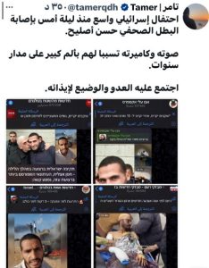 فيما نقل الصحفي في قناة الجزيرة تامر المسحال بعض المنشورات والأخبار التي نشرها الإعلام العبري حول عملية استهداف الصحفيين وحالة الانتشاء بإصابة اصليح.