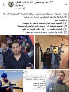لكن اللافت في الأمر أن مجموعات العميل المتخابر مع الاحتلال قامت بنعي أربعة من ضباط أجهزة أمن السلطة، وهم نقيب هاني محمد يوسف ابو صهيبان، ومساعد أول يوسف ياسر إبراهيم أبو صهيبان، ورقيب أول بلال رياض أحمد أبو تيلخ، ورقيب أول موسى حمدان محمد أبو معمر.