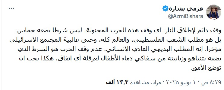 وقال مدير مركز العربي للدراسات عزمي بشارة في تغريدة له على موقع إكس: ” وقف دائم لإطلاق النار، اي وقف هذه الحرب المجنونة، ليس شرطا تضعه حماس، بل هو مطلب الشعب الفلسطيني، والعالم كله، وحتى غالبية المجتمع الاسرائيلي مؤخرا. إنه المطلب البديهي العادي الإنساني. عدم وقف الحرب هو الشرط الذي يضعه نتنياهو وزبانيته من سفاكي دماء الأطفال لعرقلة أي اتفاق. هكذا يجب ان توضع الأمور”.