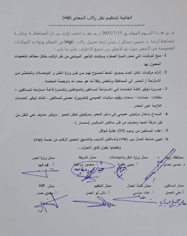 الاتفاقية التي حملت عوان (اتفاقية لتنظيم نقل ركاب المعابر VIP) ووقعت في 15 يوليو الجاري، نصت على منع المركبات التي تحمل النمرة الصفراء ومركبات التأجير السياحي من نقل الركاب بشكل مخالف للتعليمات المعمول بها.