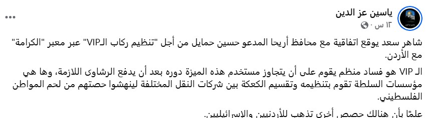 وقال في منشور له على فيسبوك: “ها هي مؤسسات السلطة تقوم بتنظيمه وتقسيم الكعكة بين شركات النقل المختلفة لينهشوا حصتهم من لحم المواطن الفلسطيني. علمًا بأن هنالك حصص أخرى تذهب للأردنيين والإسرائيليين”.