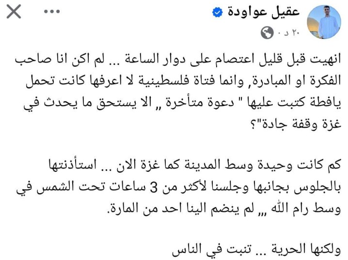 وقال الناشط الفلسطيني عقيل عواودة في منشور له على فيسبوك، بعد مشاهدته للفتاة تحتج بمفردها: “أنهيت قبل قليل اعتصام على دوار الساعة.. لم أكن أنا صاحب الفكرة أو المبادرة، وإنما فتاة فلسطينية لا أعرفها كانت تحمل يافطة كتب عليها “دعوة متأخرة.. ألا يستحق ما يحدث في غزة وقفة جادة!”.