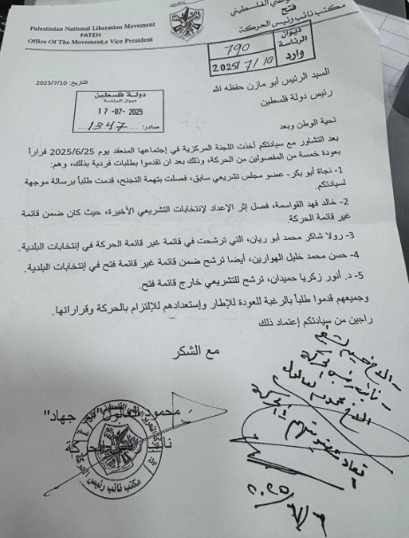 ووجه محمود العالول نائب رئيس حركة فتح رسالة لمحمود عباس بشأن إرجاعهم للحركة بعد اجتماع عقد للجنة المركزية في الـ 25 من يونيو الماضي، بعد أن تقدموا بطلبات للعودة لصفوف الحركة.