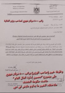 ونشرت المصادر صورة لكتاب رسمي موجه من أحد مسؤولي الوزارة يتضمن تعهدا بتوفير راتب المستشار المالي، الذي تم تعيينه على بند أحد المشاريع الممولة من البنك الدولي الموجهة لبرامج الاصلاح الاقتصادي.