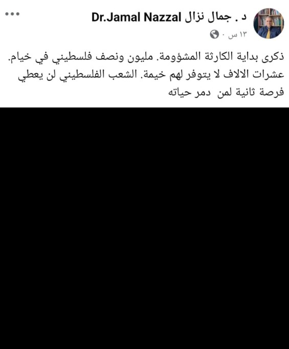 فيما كتب الناطق باسم الحركة في أوروبا جمال نزال على صفحته على فيسبوك: “ذكرى بداية الكارثة المشؤومة، مليون ونصف فلسطيني في الخيام، عشرات الآلاف لا يتوفر لهم خيمة، الشعب الفلسطيني لن يعطي فرصة ثانية لمن دمر حياته”.