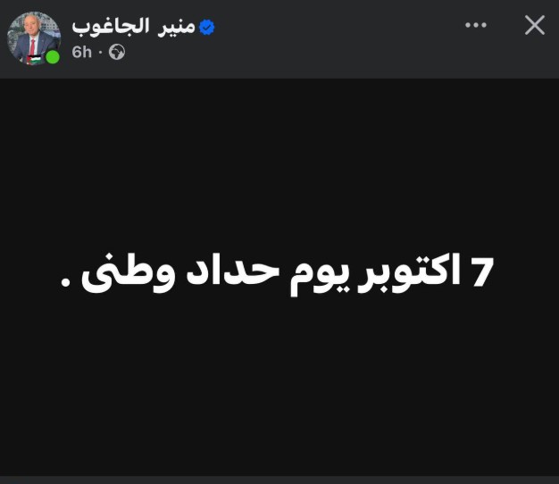 ونشر الناطق باسم حركة فتح والمستشار في وزارة الخارجية التابعة للسلطة منير الجاغوب على صفحته على فيسبوك: “7 أكتوبر يوم حداد وطني”.
