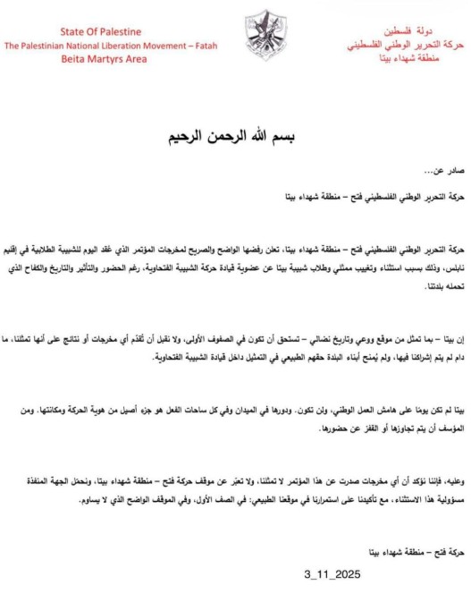 وأصدرت الشبيبة الفتحاوية في بيتا بياناً رفضت فيها مخرجات المؤتمر بسبب استثناء طلبتها من المشاركة فيه.