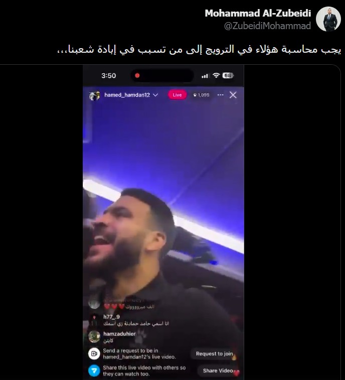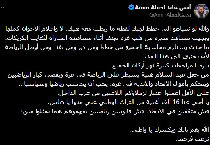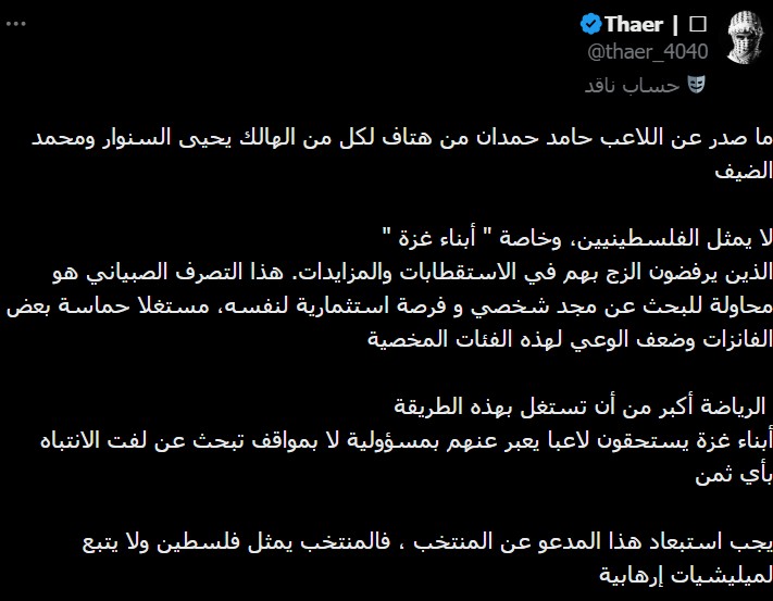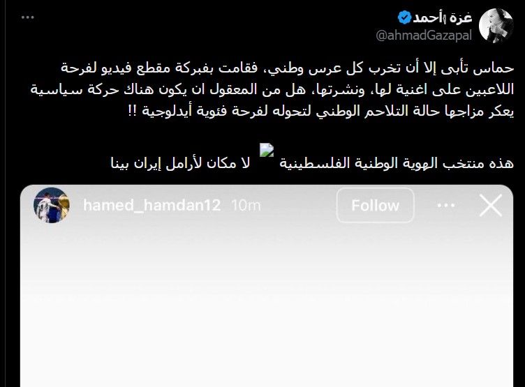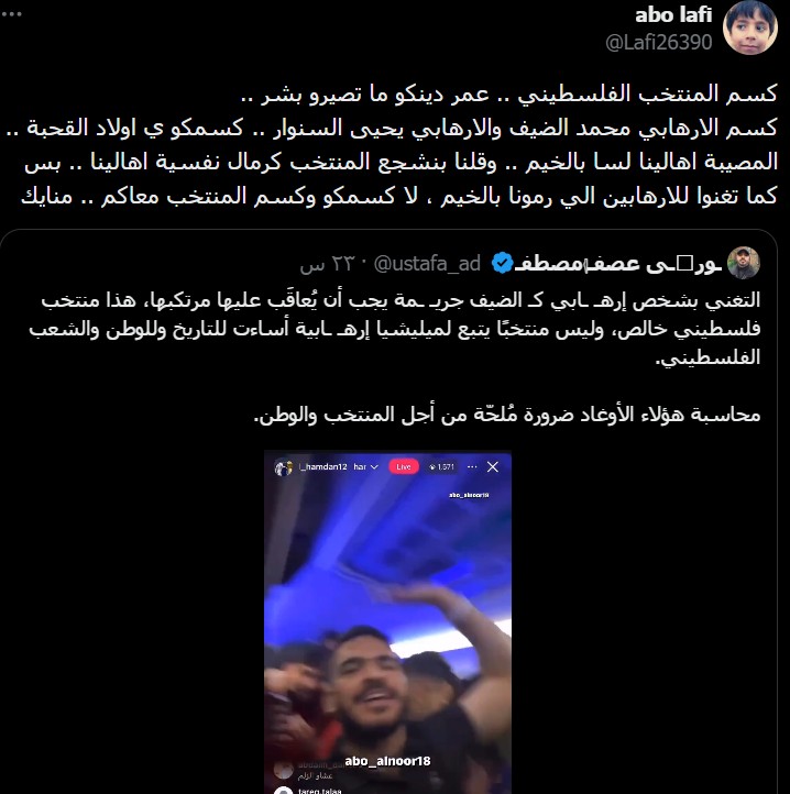وشن الذباب هجوماً كبيراً على اللاعب حامد حمدان لخروجه ببث مباشر احتفالاً بالفوز وهو يغني للمقاومة وقادتها.