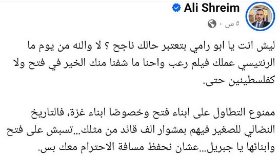 وقال المدعو علي شريم في منشور له: “ليش انت يا أبو رامي بتعتبر حالك ناجح؟ لا والله من يوم ما الرنتيسي عملك فيلم رعب، واحنا ما شفنا منك الخير في فتح ولا كفلسطينيين حتى”.
